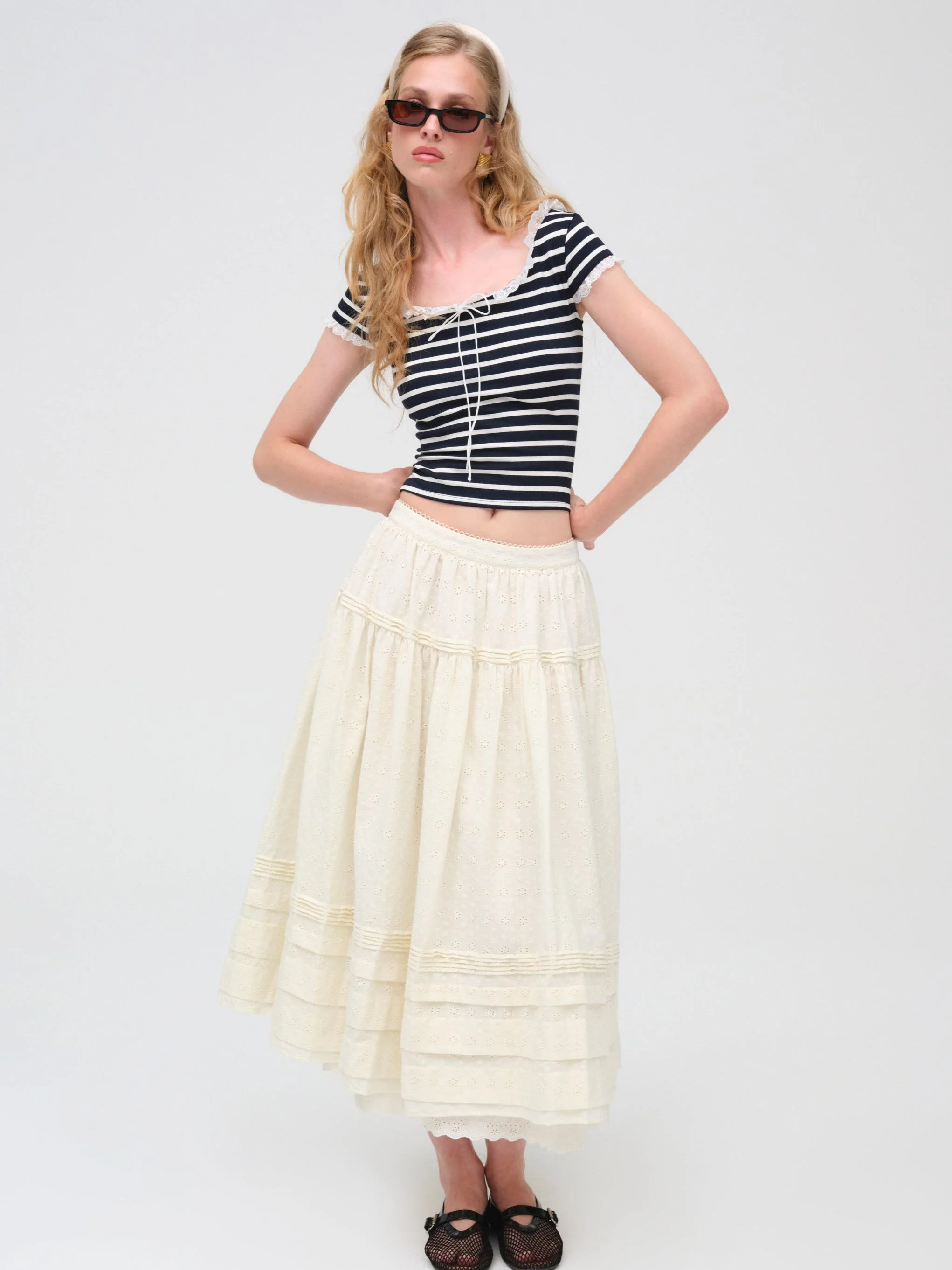 An ultra-chic transitional piece, the Eyelet white midi skirt is crafted in a crisp cotton that flares into a full gathered skirt. This high-waisted skirt is adorned with a picot trim waistband, eyelet trim hem, and wide pintucks for a nostalgic touch. Style Notes - Fully lined - No pockets - Invisible zipper at center-back Fabric + Care - Crafted in 100% cotton - Lining is made of 100% cotton - Dry clean only