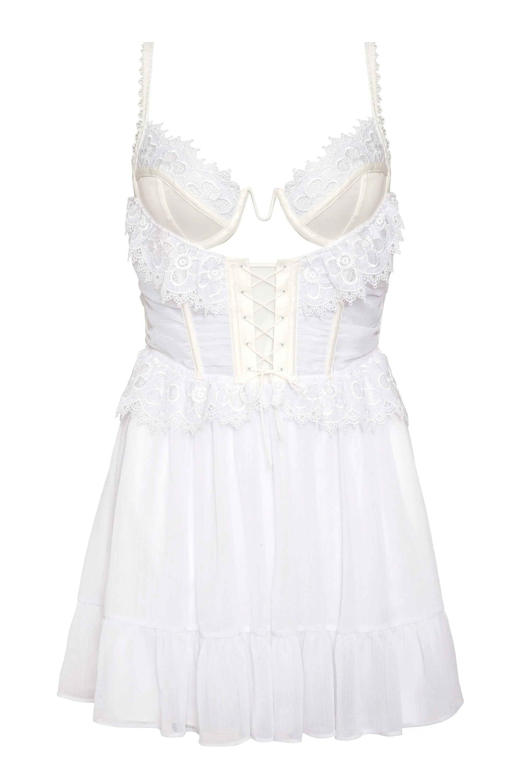 Girls just wanna have a little white slip. Style Notes - Underwire - U-wire detail - Satin cups - Chiffon corset - Embroidered ruffle trim - Front lacing detail - Lined skirt - Loop trim at shoulders Fabric + CareSelf: 100% Polyester; Contrast: 95% Polyester/ 5% Elastane Hand Wash Separately Air Dry With Care