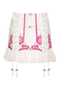 Floral embroidery blooms brightly on this concert-ready skirt, crafted in floaty chiffon with a jacquard waist panel. Finished with side lace-up details, garter straps with rosette-dotted clips, and pin-tucked pleats. Style Notes - Garter straps with clips - Invisible side zipper - Lace-up detail - Mini rosettes - Partially made with recycled materials - Imported Fabric + CareSelf: 100% Polyester; Contrast 1: 100% Viscose; Contrast 2: 100% Recycled Polyester; Embroidery: 100% Polyester