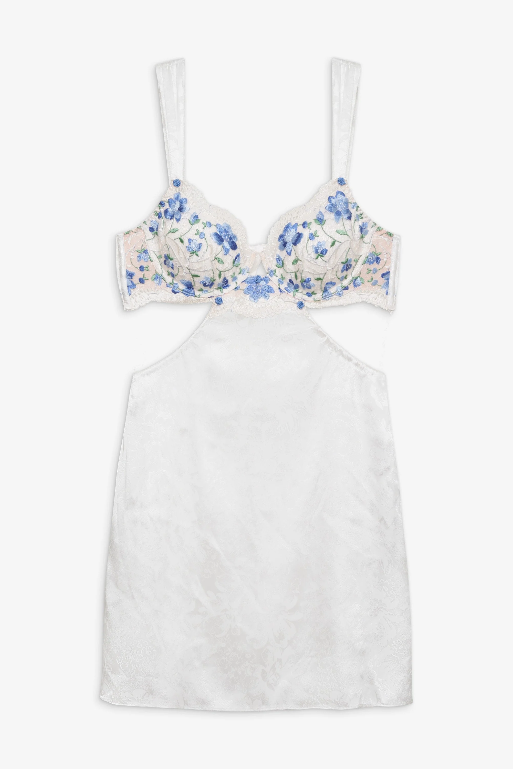Designed for slow dessert days and party-filled nights, the Festival Rose white slip dress is crafted in a sleek satin jacquard. This mini slip dress is adorned with delicate floral lace embroidery, flirty side cut-outs that lead into an open back, and a ribbon tying back. Style Notes - Lightly lined - Underwire cups - Adjustable shoulder straps with buttons Fabric + Care - Crafted in 96% polyester, 4% elastane - Lace is made of 100% polyester - Hand wash cold - Do not wring or twist - Line dry - Do not dry clean