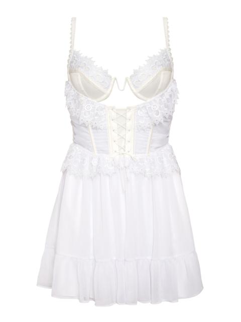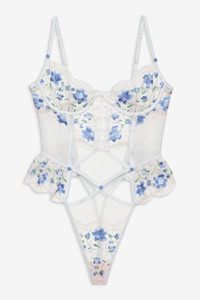 Designed for slow desert days and party-filled nights, the Festival Rose thong bodysuit is adorned with floral embroidery, a satin trim, peekaboo cut-outs,and tiny rosettes. This lingerie teddy is finished with scalloped lace and ruffles at the hips. Style Notes - Unlined - Underwire cups - Boning throughout - Pure cotton panel gusset - Hook and eye closure and button-up closure at the center-back Fabric + Care - Crafted in 100% polyester - Mesh is made of 88% polyamide, 12% elastane - Gusset is made of 100% modal - Hand wash cold - Line dry - Do not dry clean