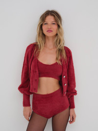 Crafted in a fuzzy mohair knit, the Fiona red knit short is both cozy and cheeky all at once. Featuring a sweater-style ribbed waistband and leg, this high-waisted short has a cheeky panty-like fit. Pair it with the Fiona Crop Top and Cardigan for the complete co-ord set. Style Notes - Unlined Fabric + Care - Crafted in 100% polyamide - Hand wash cold, dry flat; for best results dry clean