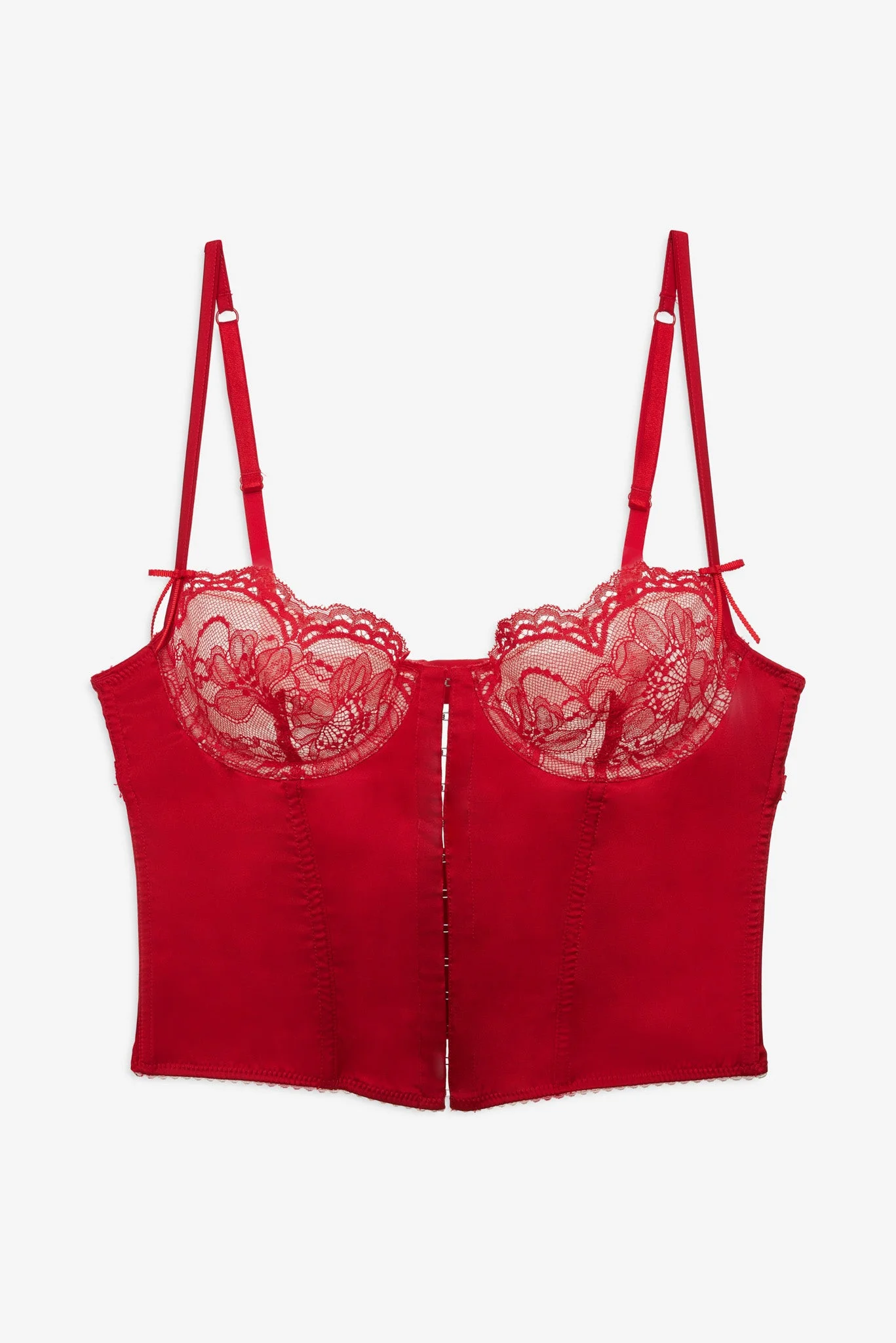 Get festive this holiday season in the Fiona red bustier—a satin and lace bustier top designed to sculpt and seduce. Featuring underwire cups, a fully boned bodice, scalloped lace trim, and delicate ribbon bows, this festive lingerie pairs with the matching Fiona Lace Thong for an unforgettable lingerie set. Style Notes - Unlined - Functional hook and eye closures at center-front - Adjustable shoulder straps - 3-row hook and eye closure Fabric + Care - Crafted in 60% polyester, 33% recycled polyester, 7% elastane - Cup is made of 93% polyamide, 7% viscose - Cup lining is made of 100% polyester - Hand wash cold - Only non-chlorine bleach - Do not wring or twist - Line dry - Do not iron - Do not dry clean