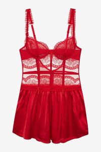 The Fiona red slip dress is crafted in lace and satin for magical mistletoe moments. Featuring underwire cups, a boned bodice, and a gathered skirt with a ruffled tulle trim—this little lace slip dress is adorned with skinny ribbon bows for a festive finish. Style Notes - Unlined - Adjustable shoulder straps - 3-row hook and eye closure - Invisible zipper at the center-back Fabric + Care - Crafted in 93% polyamide, 7% viscose - Waist is made of 100% polyamide - Mesh is made of 87% polyamide, 13% elastane - Skirt is made of 60% polyester, 33% recycled polyester, 7% elastane - Cup lining is made of 100% polyester - Hand wash cold - Only non-chlorine bleach - Do not wring or twist - Line dry - Do not iron - Do not dry clean