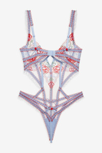For the romantic at heart, the First Crush blue underwire thong bodysuit charms with its sweet red rose and heart bow embroidery. This lingerie bodysuit spotlights sexy waist cut outs and is adorned with ruffled tulle, dotted mesh, ruffled elastic trims, and decorative rosette and bows. Style Notes - Unlined - G-string thong back - Boning throughout bodice - Adjustable shoulder straps Fabric + Care - Crafted in 100% polyester - Mesh is made of 100% recycled polyester - Gusset is made of 100% modal - Hand wash cold - Only non-chlorine bleach - Do not wring or twist - Line dry - Do not iron - Do not dry clean