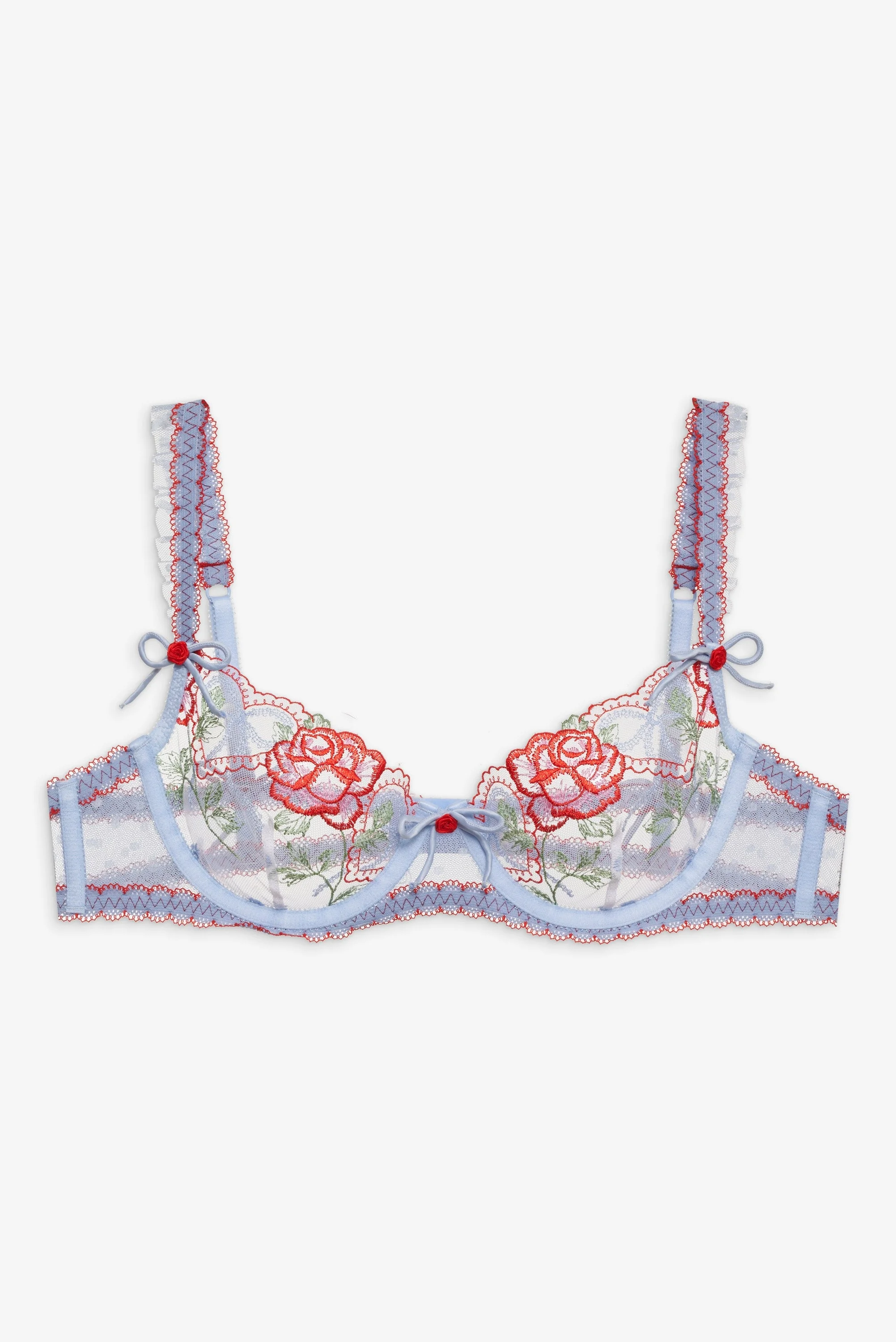 For the romantic at heart, the First Crush blue bra charms with its sweet red rose and heart bow embroidery. This underwire bra is adorned with dotted mesh wings, ruffled elastic trims, and decorative rosette topped bows. Style Notes - Unlined - Adjustable shoulder straps - Hook and eye closure at center-back Fabric + Care - Crafted in 100% polyester - Hand wash cold - Only non-chlorine bleach - Do not wring or twist - Line dry - Do not iron - Do not dry clean
