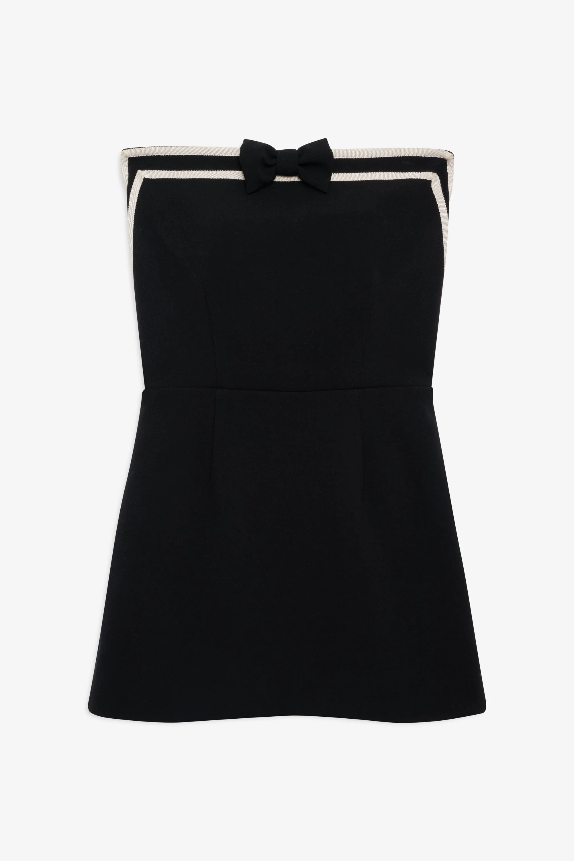 Embrace sailor girl fall with the Josie strapless mini dress—a black mini dress crafted in a suiting fabric with a nautical-inspired contrast ribbon square neckline and a center-front bow. Style Notes - Fully lined - Invisible zipper at center back Fabric + Care - True to size