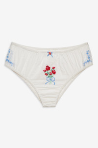 The Forget-Me-Not bloomer panty was made for the outdoor-loving Muse. This high-waisted bloomer underwear features ruffle detailing, allover floral embroidery, and a satin lingerie bow with a daisy applique detail. Style Notes - Unlined - Elasticated waist and legs Fabric + Care - Crafted 100% cotton - Machine wash cold - Lay flat to dry - Cool Iron ok - Ok to dry clean