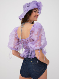 Sheer floral top with exposed halter bra in contrast floral print, gathered bodice panels, and elasticized sheer puff sleeves. Style Notes - Sheer floral fabric - Exposed floral halter bra - Gathered bodice panels - Sheer puff sleeves - Skinny tie details Fabric + CareSelf: 62% Rayon/ 38% Polyester; Lining: 95% Polyester/ 5% Spandex Eco Dry Clean recommended. Avoid cleaners that use harmful chemicals like "Perc".