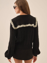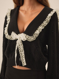 A must-have layer for your winter wardrobe, the Frenchy black cardigan exudes femininity with its pointelle knit and scalloped eyelet trims. Featuring a sailor style collar, this relaxed fit black cardi has a deep V neckline with a satin ribbon that ties at the front, and billowy long sleeves with rib cuffs. Fit Notes - True to size Style Notes - Unlined - Slightly cropped length Fabric + Care - Crafted in 100% cotton - Dry clean only