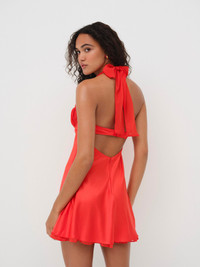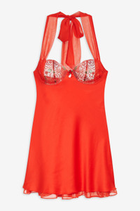 Embrace the magic of the festive season with the ultra-sexy Gene red slip dress. Featuring rose-embroidered underwire cups with a touch of lurex sparkle, this mini negligee spotlights shirred chiffon straps and a ruffled lining that peeks out just below the hem. Style Notes - Invisible zipper at the center-back - Open back with elasticized bra clasp closure - Center-front keyhole with rosette at the top edge Fabric + Care - Fully lined
