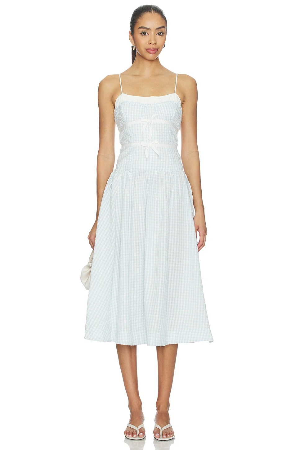 - Self & Lining: 100% cotton - Machine wash - Partially lined - Hidden back zip closure - Adjustable shoulder straps - Front bow detailing - Midweight seersucker fabric - Revolve Style No. FORL-WD1466 - Manufacturer Style No. CD3686-SP26-BLUE