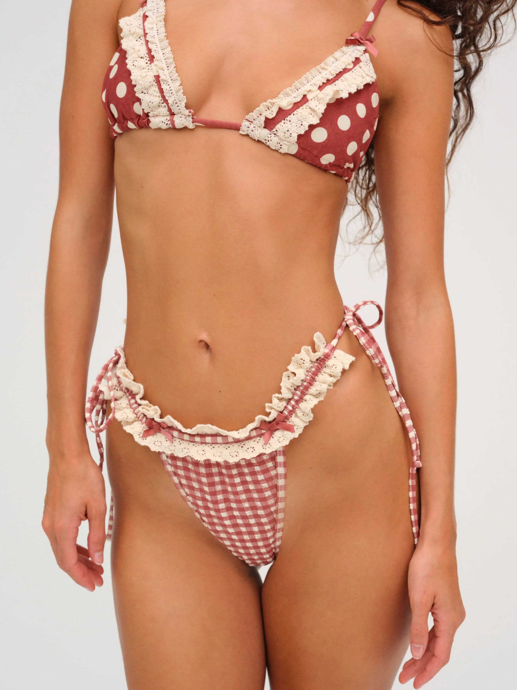 Inspired by vintage swimwear–the Gingham red bikini bottom is crafted in a retro polka dot print and adorned with ruffled crochet lace trim, plus bow appliques. This classic string thong bikini bottom features adjustable string ties at hips for the easiest fit. Pair it with the Dolly Dot Triangle Bikini Top for the full bikini set. Style Notes - Fully lined - Elasticated waist - Adjustable ties at hips Fabric + Care - Crafted in 48% polyester, 45% nylon, 7% spandex - Lining is made of 90% nylon, 10% spandex - Hand wash cold - Drip dry in shade - Do not tumble dry - Do not iron - Do not dry clean