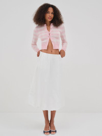 Embrace summertime sweetness with the pink gingham cardigan—a crew-neck cardi with long sleeves and jeweled buttons.
