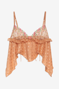 The Glimmer Rosebud polka dot top was designed to take you from the bedroom to brunch in a beat. Crafted in a lightweight dot jacquard, this satin camisole features embroidered triangle cups, scrunchie shoulder straps, an asymmetrical hem, and decorative bows throughout. Style Notes - Cup lining - Elasticated back neckline - Ruffled bra band - Adjustable shoulder straps Fabric + Care - Crafted in 97% polyester, 3% elastane - Lace is made of 100% polyester - Embroidery is made of 92% polyester, 8% metallic fiber - Hand wash cold - Only non-chlorine bleach - Do not wring or twist - Line dry - Do not iron - Do not dry clean