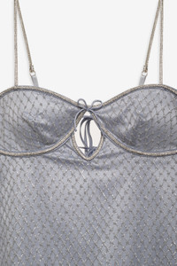 A Highly Coveted FL&L style, the bestselling Glitter silver slip dress enchants all year round. Coated in rhinestone embellishments, this embellished mini dress spotlights keyhole cutout accents. Style Notes - Adjustable spaghetti straps - Open back with strappy detail - Hits at mid thigh - Rhinestone embellishments - Fully lined Fabric + Care - Crafted in 100% polyester - Lining is made of 95% polyester, 5% elastane - Eco dry clean advised