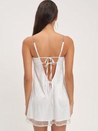 A Highly Coveted FL&L style, the bestselling Glitter white slip dress enchants and amplifies your honeymoon wardrobe. Coated in rhinestone embellishments, this embellished mini dress spotlights keyhole cutout accents. Style Notes - Fully lined - Functional back tie closure - Adjustable spaghetti straps Fabric + Care - Crafted in 100% polyester - Hand wash cold, do not wring or twist - Line Dry Only