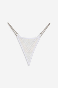 A Highly Coveted For Love & Lemons style, the Glitter white thong brings glitz and glamor to your honeymoon wardrobe. Crafted in embroidered tulle mesh, this high cut thong spotlights a glittery grid print and embellishments at the hip. Pair it with the Glitter Bralette for a matching set. Style Notes - Mid rise - High-cut leg - Thong back coverage Fabric + Care - Crafted in 100% polyester - Hand wash separately, air dry with care