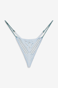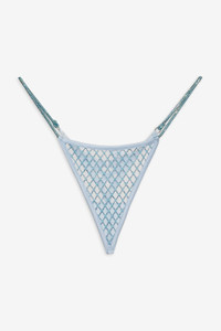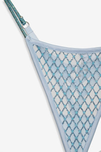 A Highly Coveted For Love & Lemons style, the Glitter blue thong brings glitz and glamor to your top drawer. Crafted in embroidered tulle mesh, this high cut thong spotlights a glittery grid print and embellishments at the hip. Pair it with the Glitter Bralette for a co-ord lingerie set. Style Notes - Mid rise - High-cut leg - Thong back coverage - Imported Fabric + Care - Crafted in 100% polyester - Gusset is made of 100% modal - Hand Wash Separately - Air Dry With Care