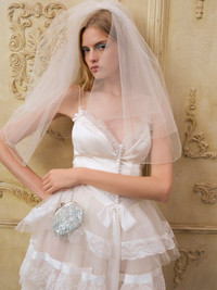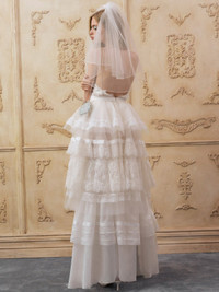 A grand bridal gown defined by intentional layering and vintage-inspired romance. A structured satin bodice with lace insets and bridal buttons gives way to a dramatic tiered skirt of tulle, organza, and chiffon — each layer finished with delicate lace for an heirloom feel. Style Notes - Heavy satin bodice with side-seam boning - Various lace trims throughout - Chiffon bows - Bridal buttons at front bodice - Lace inset at waist - Satin ribbon detail at waistband - Chiffon bow at front waist - Tiered skirt in layers of tulle, organza, and chiffon - Fixed straps with excess for adjusting - Invisible zipper - Fully lined with built-in bodysuit Fabric + Care - Crafted in 100% recycled polyester - Contrast is made of 100% polyester - Lining 1 is made of 97% recycled polyester, 3% spandex - Lining 2 is made of 100% recycled polyester - Lining 3 is made of 51% polyester, 49% nylon - Dry clean only