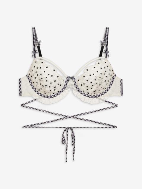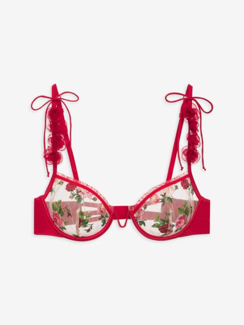 The Hallie red underwire bra cuts a romantic mood. Featuring a satin half-cup lining and double layered satin halter straps, this sexy bra spotlights irresistible bow appliques and an enamel bow charm above the center-front keyhole. Pair it with the Hallie Thong Panty for a complete lingerie set. Style Notes - Halter straps tie into bow at the back - Hook and eye tape closure Fabric + Care - Crafted in 95% polyester, 5% elastane - Lace is made of 100% polyamide - Embroidery is made of 100% polyester - Hand wash cold, Line dry
