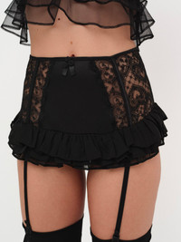Play your cards right this Valentine’s Day with the vintage-inspired Heartbeat lace garter skirt–an ultra-sexy micro skirt that features a built-in panty for an alluring look. Adorned with sheer heart embroidery side panels, rosette appliques at center front, and flirty tiered tulle ruffles—this lingerie skirt is your new good luck charm this season. Style Notes - Unlined - Built-in panty - Snaps at gusset - Functional garter clips - Invisible zipper at center back Fabric + Care - Crafted in 60% polyester, 33% recycled polyester, 7% elastane - Lace is made of 100% recycled polyester - Embroidery is made of 100% polyester - Ruffles are made of 100% polyester - Gusset lining is made of 100% viscose - Hand wash cold - Do not wring or twist - Do not iron - Do not dry clean