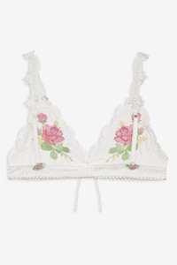 Lose yourself in the romance of the outdoors with the Heirloom Rose floral bralette–a classic triangle bralette crafted in a delicate dotted mesh. Adorned with dainty lace trims and intricate rose appliques, this white bralette features a wide jacquard pin-tucked waistband, decorative rosettes, and a center-front fixed bow. Style Notes - Unlined - Adjustable shoulder straps - Hook and eye closure at center-back Fabric + Care - Crafted in 82% polyamide, 18% elastane - Bottom band is made of 100% polyester - Back wing is made of 97% polyester, 3% elastane - Hand wash cold - Line dry - Do not dry clean