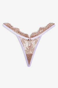 Crafted in chocolate brown lace, the Holly lace panty was designed for the fall femme. This brown panty features contrast satin hip straps, a front keyhole cut-out, and decorative rosettes. Pair it with the Holly Underwire bra for a complete lingerie set. Style Notes - Unlined - G-string back coverage Fabric + Care - Crafted in 100% polyester - Gusset is made of 100% modal - Hand wash cold - Only non-chlorine bleach - Do not wring or twist - Line dry - Do not iron - Do not dry clean