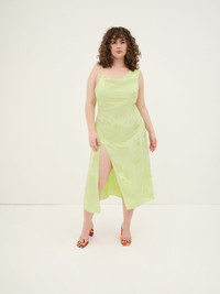 Floral jacquard midi dress with asymmetrical cowl neckline and pleats along waist. Easy fit skirt with thigh-high slit and SS invisible zipper. Style Notes - Asymmetrical cowl neck - Adjustable straps - Side ruched details - Thigh-high side slit - Invisible zipper closure in back - Imported Fabric + Care100% Rayon Eco Dry Clean Advised. Avoid Cleaners That Use Harmful Chemicals Like "Perc."
