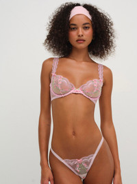 Become the ultimate Valentine’s Day Muse with the Ily Embroidered underwire bra–a pink bra adorned with dainty floral embroidery, slotted ribbon trims, and romantic rosettes atop satin ribbon bows decorated with pearl beads. Style Notes - Unlined - Cage back with bra hook and eye closure - Adjustable shoulder straps Fabric + Care - Crafted in 100% recycled polyester - Embroidery is made of 100% polyester - Hand Wash Cold - Do not wring or twist - Line dry - Do not iron - Do not dry clean