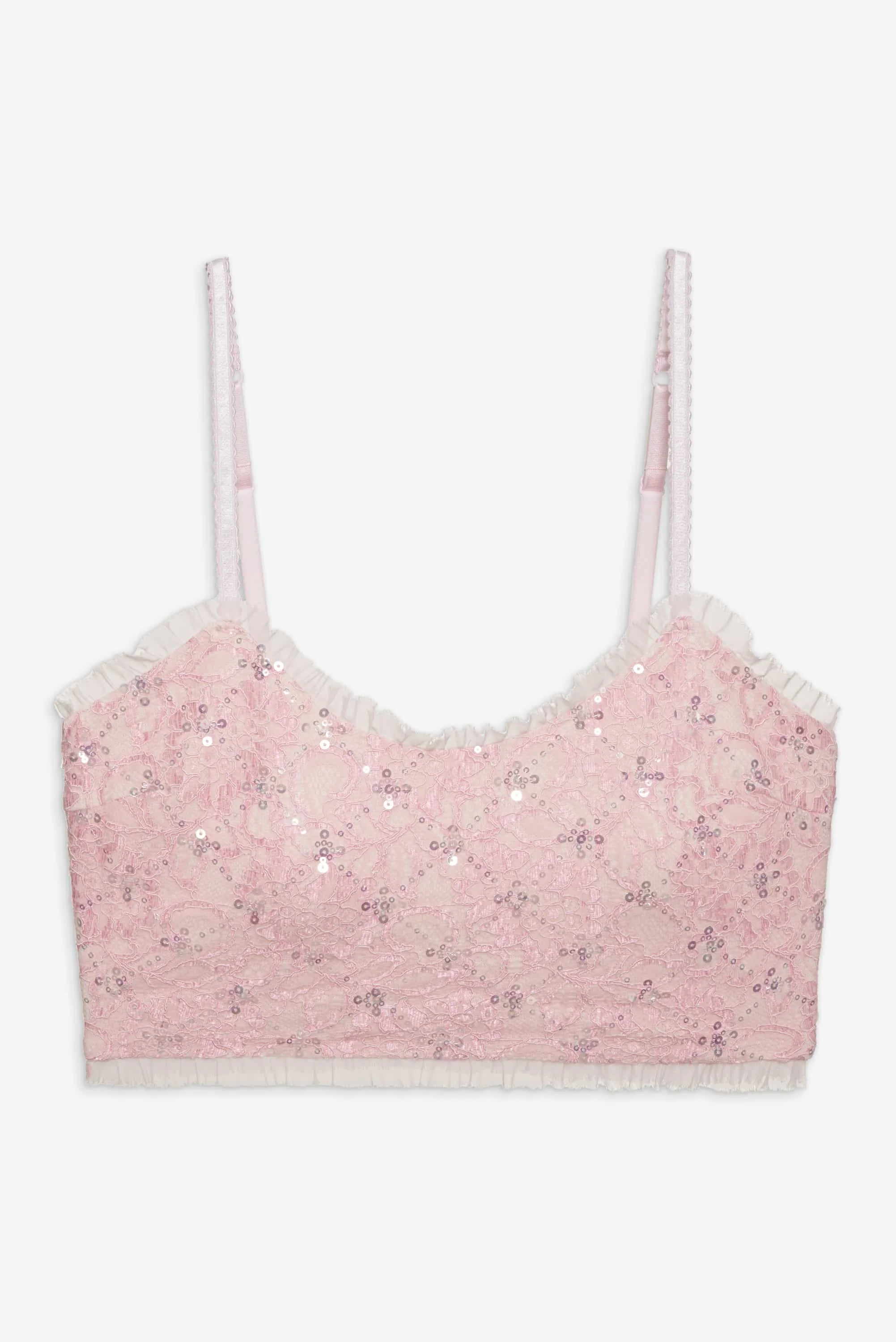 Put on a shimmering display in the Isabeau pink cami top—a knit tank featuring allover lace detailing, raw edge chiffon ruffles at the neckline and hem, plus allover sequin detailing. Pair it with the Isabeau Cardigan for a matching twinset. Style Notes - Fully lined - Adjustable shoulder straps Fabric + Care - Crafted in 63% viscose, 37% polyamide - Backing is made of 100% acrylic - Lining is made of 95% polyester, 5% elastane - Hand wash cold, do not wring or twist - Line dry only