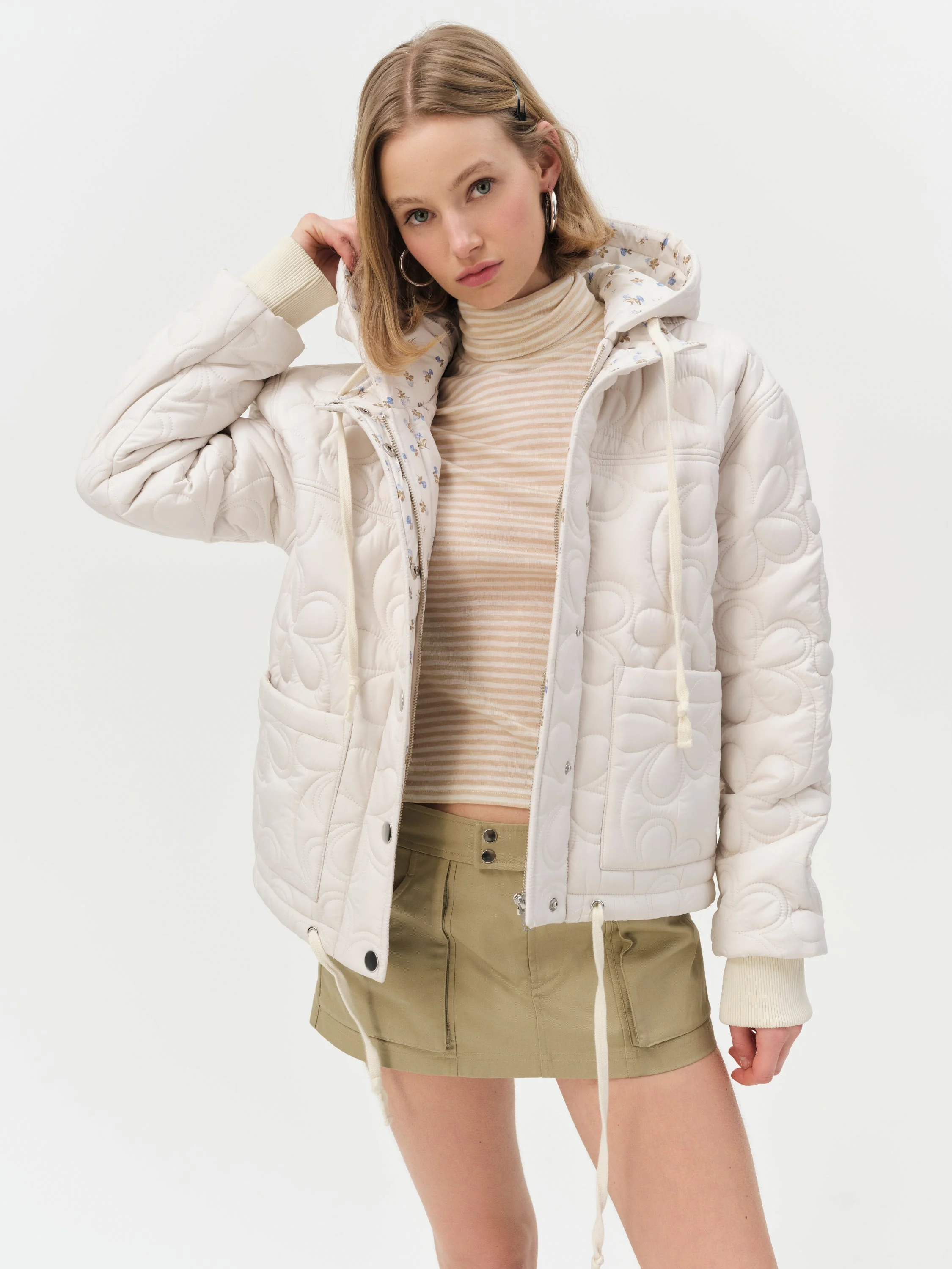 Layer your way into the a new season with the Isabel quilted puffer jacket—a cream puffer coat rendered in a cream quilted floral and contrast floral print. This puffer jacket spotlights an oversized hood and front patch pockets. Style Notes - Fully lined in contrast floral print - Functional snaps and a zipper at the center-front - Drawstring at neckline and hem Fabric + Care - Crafted in 100% polyester - Lining is made of 100% polyester - Dry clean only