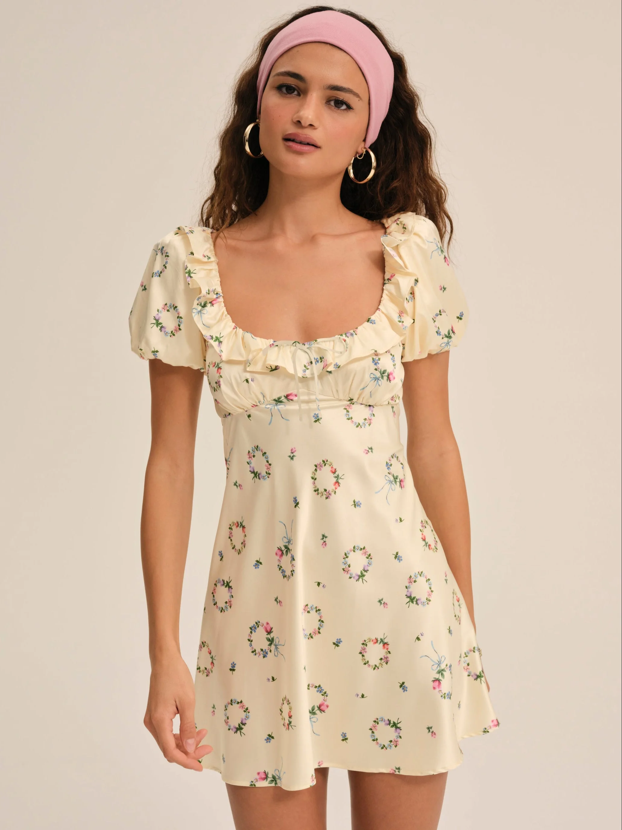 Embrace the warmth and romance of summer with the Jaida floral mini dress–a short sleeve mini dress designed with a ruched bust, a ruffled neckline, and adorned with a center-front bow. Fit Notes - True to size - Relaxed fit throughout Style Notes - Lined at bust only - Not sheer - Elasticated sleeve opening - Invisible zipper at center-back Fabric + Care - Crafted in 95% polyester, 5% spandex - Lining is made of 100% polyester - Dry clean only