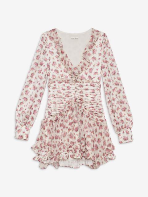 Embrace your inner flower child with the Jayleen blue mini dress, designed to take you through the early days of spring and into late summer. This ruffle mini dress features an ultra-feminine pansy burnout print, cascading ruffle details, and a handkerchief hem skirt. Style Notes - Mini ruffle trim - Functional dorset buttons along the front - Gathered angled waist seam - Fully lined Fabric + CareCrafted in 100% polyester Lining is made of 98% recycled polyester, 2% spandex Eco Dry Clean recommended