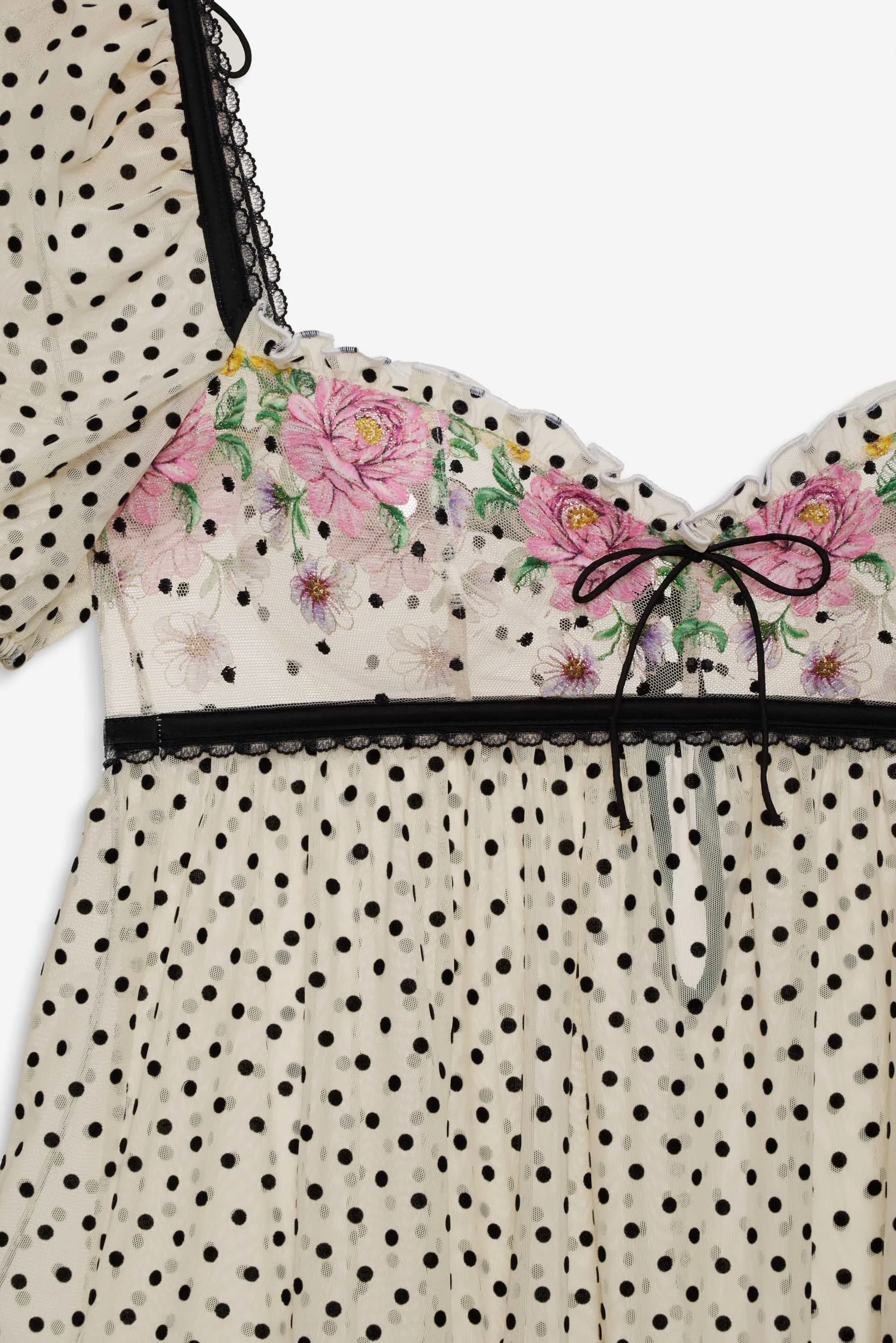 Designed for the ethereal Muse, the Joannie pink slip dress is embroidered with beautiful blooms and contrast polka dots. This floral slip dress spotlights elegant puff sleeves and a gathered skirt. Style Notes - Unlined - No underwire - Decorative picot elastic - Functional covered buttons and keyhole at the center-back Fabric + Care - Crafted in 88% polyamide, 12% elastane - Flocking is made of 100% polyamide - Lace is made of 100% recycled polyester - Hand wash cold, do not wring or twist - Line dry only