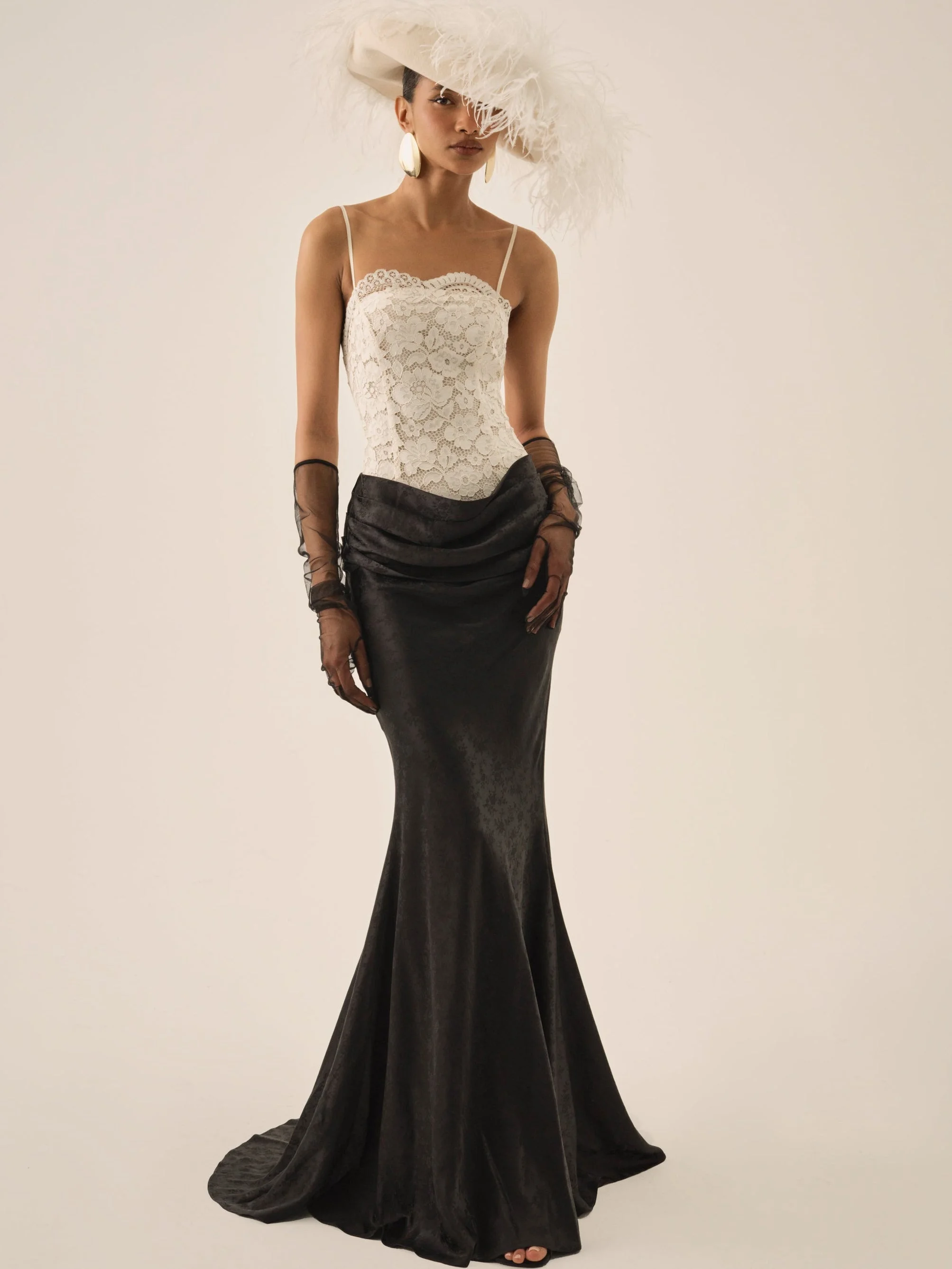 FL&L Keepsakes: An ode to timeless glamor—the Karissa black gown evokes the elegance of a bygone era, pairing a delicate lace bodice with a sculptural satin jacquard skirt. Designed for the season's chicest soirees, this black maxi dress features a scalloped neckline, slender straps, and a seductive open back; its bias-cut skirt drapes effortlessly along the hips, creating a fluid, floor-grazing silhouette. Fit Notes - True to size Style Notes - Interior bodysuit lining with snap crotch closure - Princess seams - Adjustable spaghetti straps - Elasticized leg holes - Invisible zipper at the center-back Fabric + Care - Crafted in 64% recycled polyester, 36% polyester - Secondary fabric is made of 100% silk - Lining is made of 92% silk, 8% spandex - Dry clean only