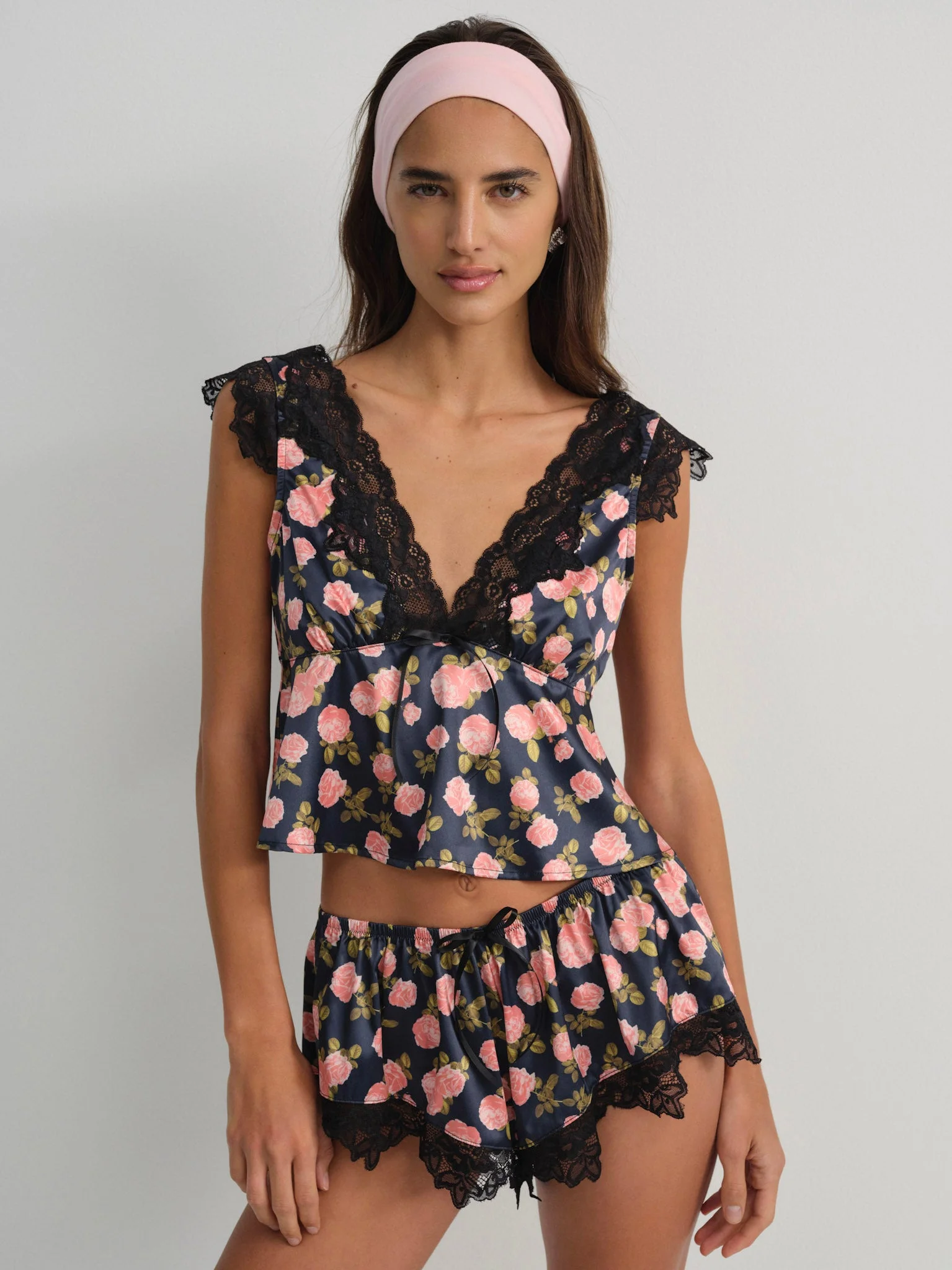 Blur the line between lingerie and everyday dressing with the Kayla sleep top—a V-neck satin crop top rendered in a romantic navy rose print and adorned with lace trims and decorative bows. Pair it with the Kayla Sleep Short for the full satin pajama set. Style Notes - Unlined - Pull-on style - Elasticated back waist Fabric + Care - Crafted in 96% recycled polyester, 4% elastane - Waist lace is made of 90% polyamide, 10% elastane - Hand wash cold - Only non-chlorine bleach - Do not wring or twist - Line dry - Do not iron - Do not dry clean