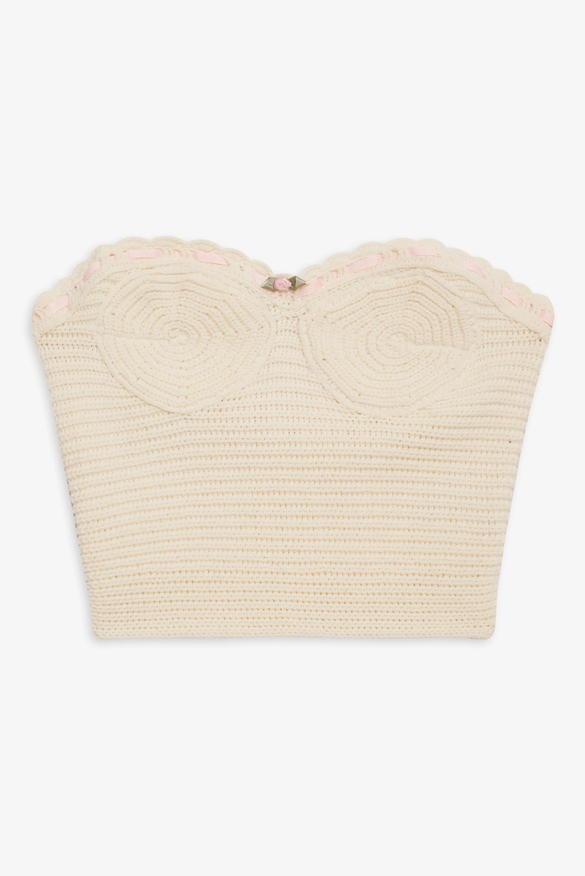 A crochet crop top with pink rosette—that's amore. This cream crochet corset is cut to a cropped length and features a bandeau neckline with a romantic grosgrain ribbon that's interwoven through the trim. Style Notes - Shelf bra lining - Circular patterns on cup - Scalloped neckline Fabric + CareSelf: 50%Polyester/ 50%Cotton; Lining: 100% Cotton