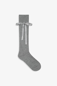 These knee high grey socks are crafted with a stretch knit, and adorned with a bow applique.
