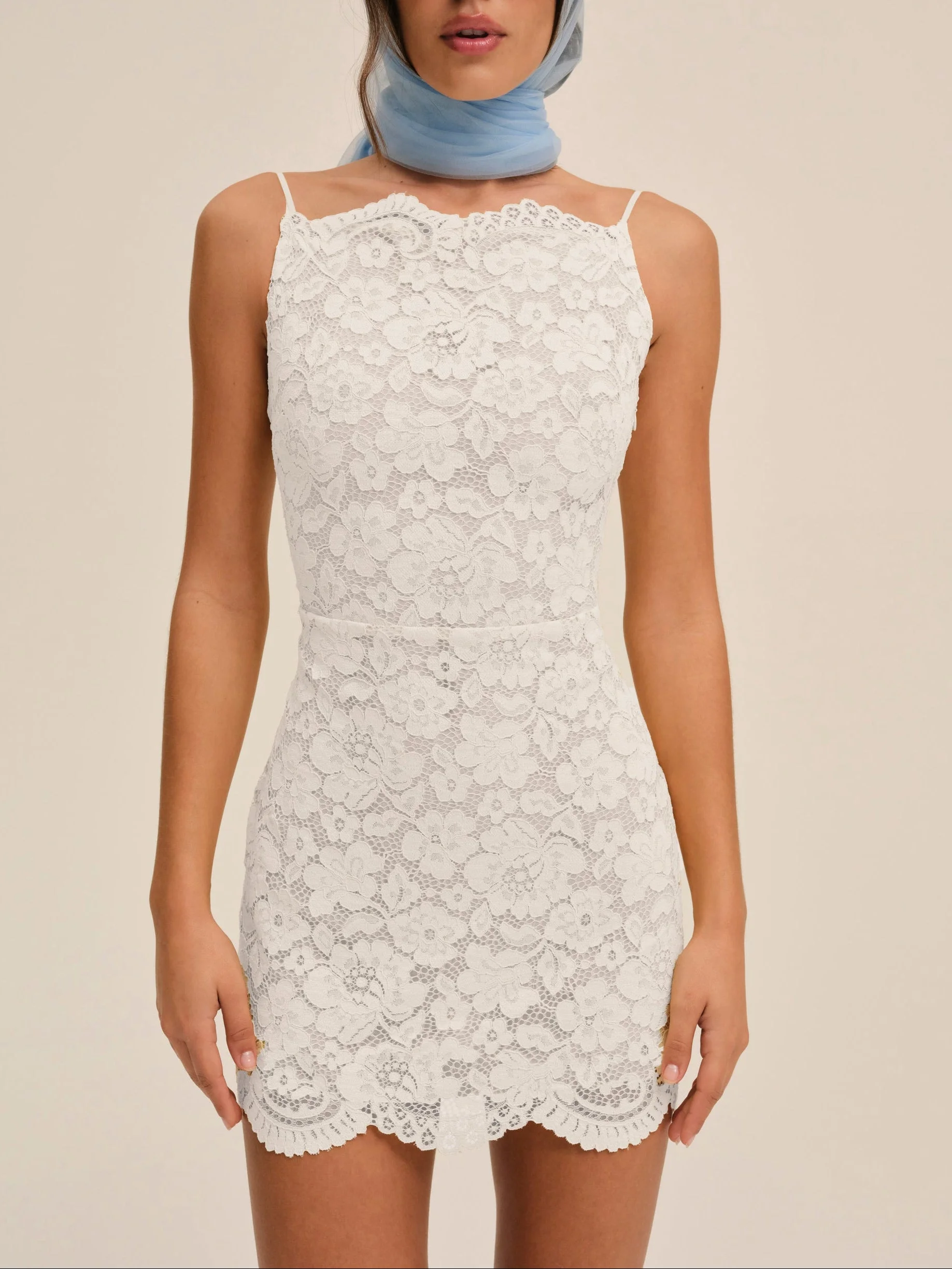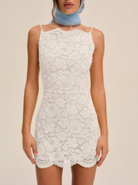 Dress for the Riviera with the Lakeside lace mini dress–a little white dress crafted in a classic floral lace and adorned with scallop hems. This high neck dress features a low open v-shaped back for an effortlessly feminine chic look. Fit Notes - True to size - Fitted throughout Style Notes - Fully lined in semi sheer chiffon - Sheer lace fabric - Side seam darts at bust - Invisible zipper at side seam Fabric + Care - Crafted in 64% recycled polyester, 36% polyester - Lining is made of 100% polyester - Dry clean only