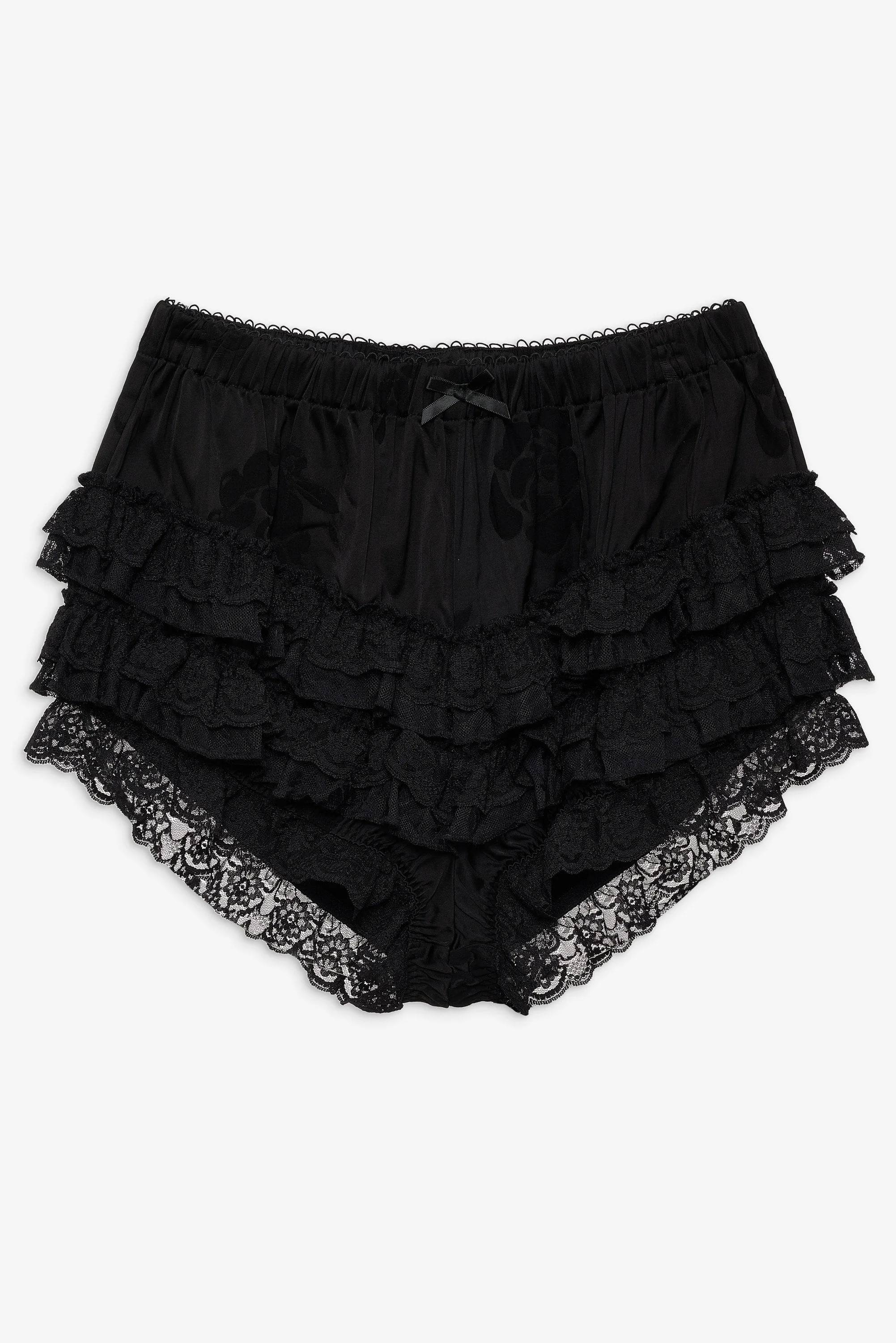 Designed for the dreamiest spring days and party-filled nights, the Lana Bloomer Short is crafted in an intricate floral jacquard and adorned with a ruffled lace trim. These black bloomers feature decorative picot elastic and a center front-bow applique detail. Style Notes - Unlined - Scrunchie elasticized waistband - Elasticized leg openings Fabric + Care - Crafted in 98% viscose, 2% elastane - Hand wash cold - Line dry - Do not dry clean