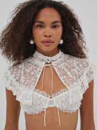 Designed for a romantic summer, the Layered Cake chiffon collar exudes femininity and vintage charm. Crafted in a sheer eyelet, this lace shawl features a functional button and tie at neck, and is adorned with tiered chiffon ruffles and eyelet trims. Style Notes - Unlined - Gathered collar Fabric + Care - Crafted in 100% polyester - Hand wash cold - Only non-chlorine bleach - Do not wring or twist - Line dry - Do not iron - Do not dry clean