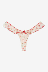 Sweet as a garden daydream, this chiffonpanty blooms with rosebuds, ribbon trim, and satin bows. Plus, ruffled edges give it a nostalgic charm. Complete the look with the Leah Underwire Bra. Style Notes - Slotted ribbon trim - Satin lingerie bows - Self ruffle at waist - Thong back - Gusset lining only Fabric + Care - Crafted in 100% polyester - Gusset is made of 100% viscose - Hand wash cold - Only non-chlorine bleach - Do not wring or twist - Line dry - Do not iron - Do not dry clean