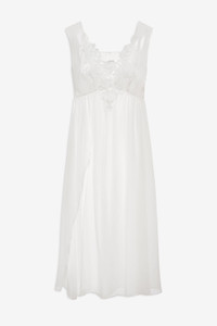 A lightweight woven and chiffon white maxi dress swim cover-up with a gathered sheer skirt and floral lace applique at the neckline, designed to catch the bayside breeze after the sun begins to dip. Style Notes - V-neck - Gathered sheer chiffon skirt - Floral lace applique at center front neckline - Fully functional lace up ties at center back - Bodice lining only Fabric + Care - Bodice is crafted in 100% polyester - Skirt is made of 100% polyester - Lining is made of 100% polyester - Hand wash cold - Drip dry in shade - Do not tumble dry - Do not iron - Do not dry clean