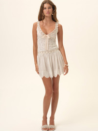 An embroidered white tulle mini dress featuring heart motifs, scalloped trims, and beaded heart straps. The flared silhouette and sheer cutaway at the back add a modern edge to a romantic bridal mini dress. Style Notes - Locked hearts beaded trim straps - Scalloped neckline and hem - Godets in skirt - Invisible zipper - Fully lined with cutaway at back under lace Fabric + Care - Crafted in 100% polyester - Lining is made of 100% polyester - Dry clean only