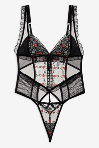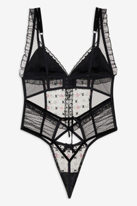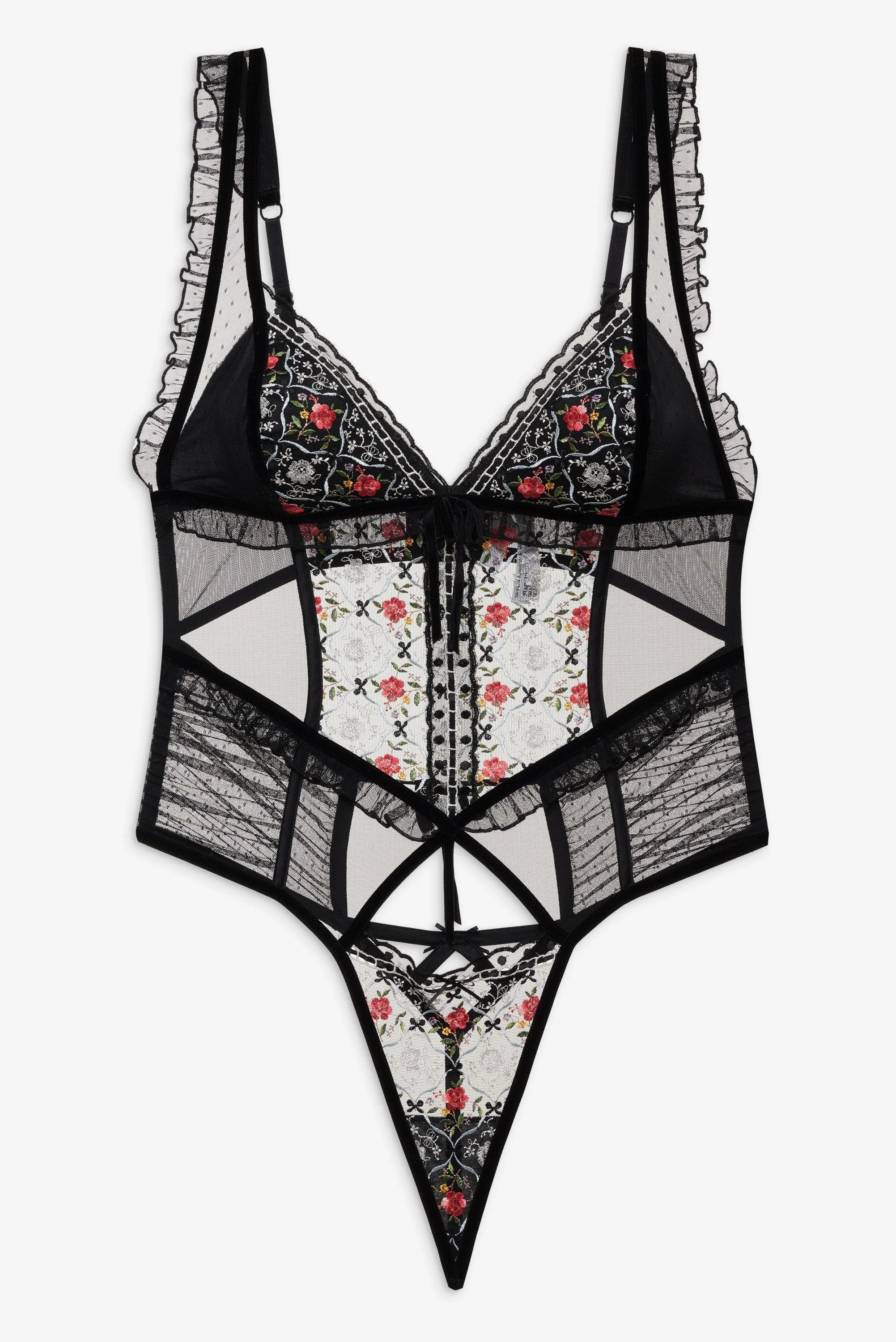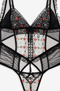 Steal a kiss under the mistletoe in the Loretta black teddy—a sexy bodysuit featuring intricate floral embroidery and dotted mesh panels throughout. This one-piece also spotlights ruffles, decorative ribbon bows, and a velvet bow at the center-front.