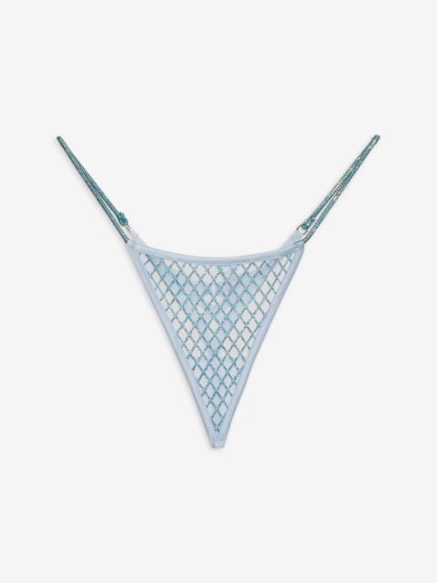 Got the blues for you. Style Notes - Floral print - Decorative picot trimmed edge - Shearing detail at front & back - Self tie skinny bow detail at center-front - Thong coverage Fabric + Care - Crafted in 88% polyester, 12% elastane - Gusset is made of 100% modal - Machine wash cold - Tumble dry low