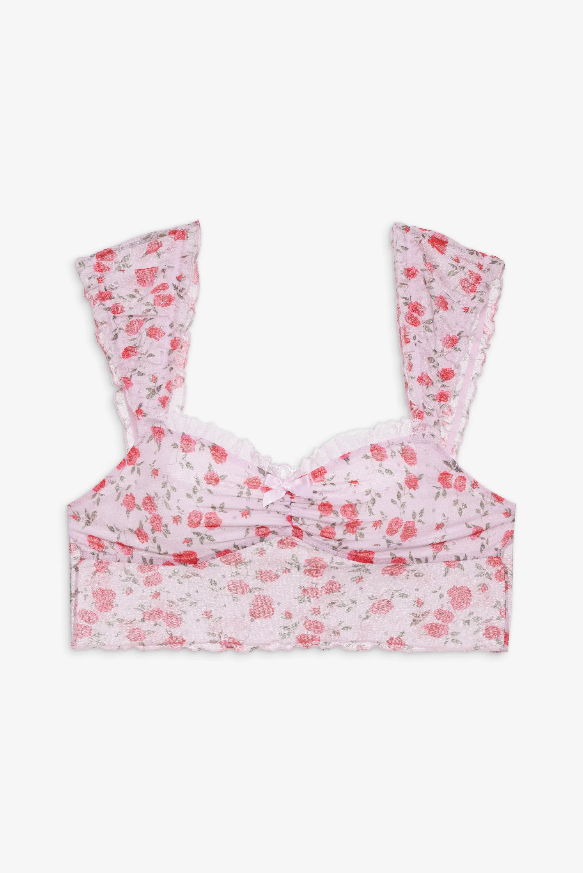 Embrace Valentine’s Day charm with the Lottie pajama top–a romantic and kitschy mesh top crafted in a festive floral print, and adored with lace trim, lettuce edge cap sleeves and hem, plus a center-front satin bow. Style Notes - Cup lining only Fabric + Care - Crafted in 88% polyester, 12% elastane - Hand wash cold - Do not wring or twist - Line dry - Do not iron - Do not dry clean