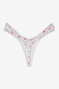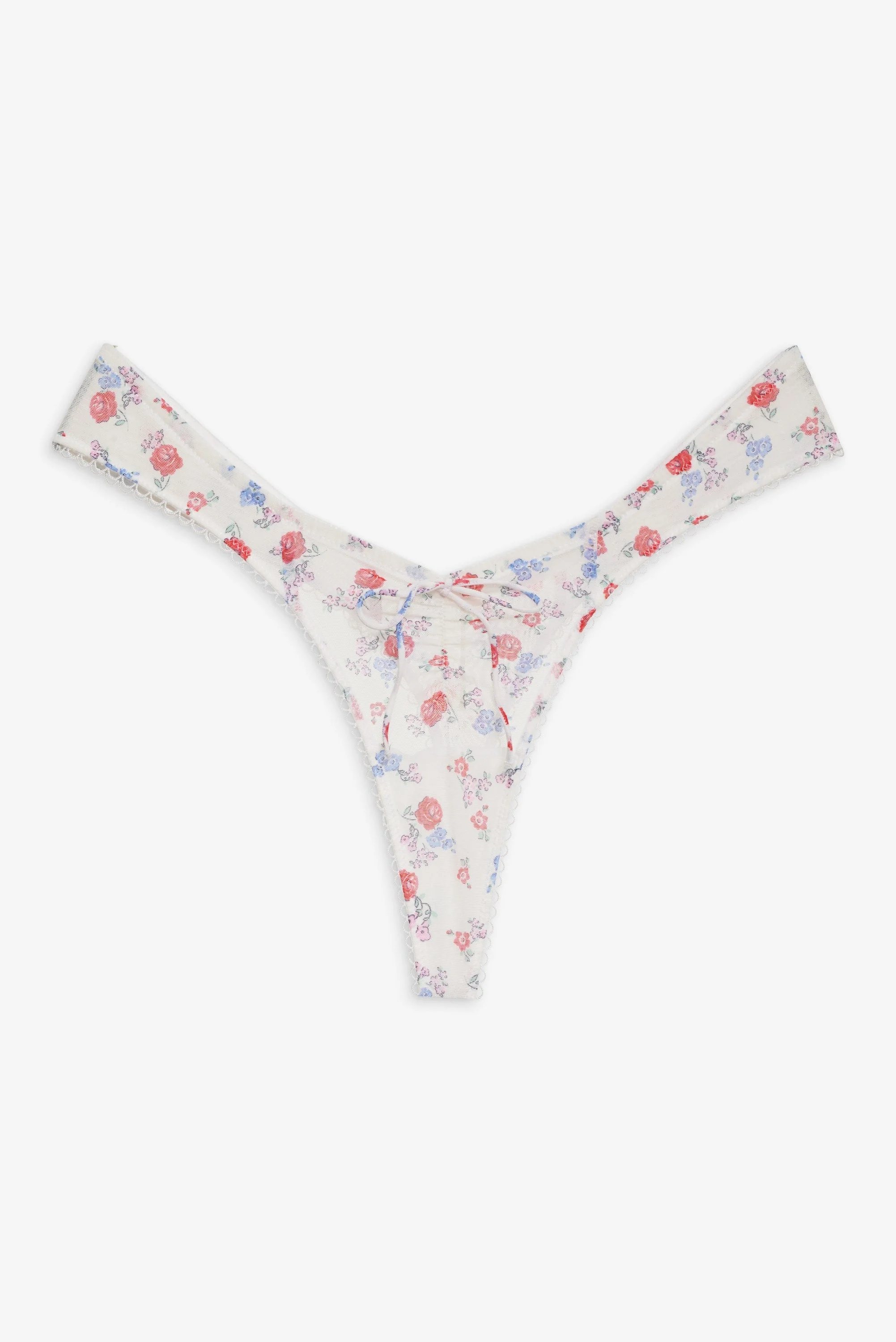 Embrace the beauty of nature with the Lottie thong panty–a romantic and wildflower-inspired white thong crafted in a sweet floral print, featuring a dainty picot trim and a sweet center front decorative bow. Style Notes - Shirring scrunch details at front and back Fabric + Care - Crafted in 87% polyamide, 13% elastane - Lining is made of 92% polyamide, 8% elastane - Gusset is made of 100% viscose - Hand wash cold - Only non-chlorine bleach - Do not wring or twist - Line dry - Do not iron - Do not dry clean