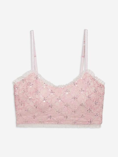 Add a touch of vintage romance to your mini dress or lingerie set with the Love Garden sheer shrug. This sheer cropped cardigan is crafted in a sheer chiffon, adorned with floral embroidery, a ruffled collar, and a center-front functional ribbon tie. Style Notes - Unlined Fabric + Care - Crafted in 100% polyester - Lace is made of 100% recycled polyester - Embroidery is made of 100% polyester - Hand wash cold - Do not wring or twist - Line dry - Do not iron - Do not dry clean